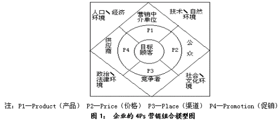 4Ps的提出奠定了管理營銷的基礎理論框架,該理論以單個企業(yè)作為分析單位,認為影響企業(yè)營銷活動效果的因素有兩種:一種是企業(yè)不能夠控制的,如政治、法律、經濟、人文、地理等環(huán)境因素,稱之為不可控因素,這也是企業(yè)所面臨的外部環(huán)境;一種是企業(yè)可以控制的,如產品、價格、渠道、促銷等營銷因素,稱之為企業(yè)可控因素。企業(yè)營銷活動的實質是一個利用內部可控因素適應外部不可控環(huán)境的過程,即通過對產品、價格、渠道、促銷的計劃和實施,對外部不可控因素做出積極動態(tài)的反應,從而促成交易的實現(xiàn)和滿足個人與組織的目標,用科特勒的話說就是“如果公司生產出適當?shù)漠a品,定出適當?shù)膬r格,利用適當?shù)姆咒N渠道,并輔之以適當?shù)拇黉N活動,那么該公司就會獲得成功”(科特勒,2001)。所以市場營銷活動的核心就在于制定并實施有效的市場營銷組合(如圖1所示)。