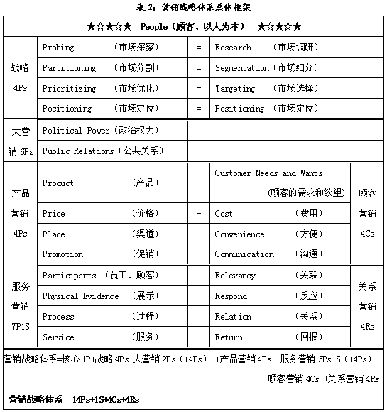 由以上的分析總結出營銷戰(zhàn)略體系總體框架如表2所示,營銷戰(zhàn)略體系可以總結為“14Ps+1S+4Cs+4Rs”,14Ps包括1P,即以顧客為核心、以人為本;4Ps,即營銷戰(zhàn)略計劃過程;另一個4Ps,即以企業(yè)為中心的產品營銷組合策略理論;2Ps(+4Ps),即強調政治權利和公共關系的大營銷理論;3Ps(+4Ps),即強調員工、顧客、展示和過程的服務營銷理論。1S指服務營銷;4Cs指以顧客為中心的顧客營銷組合策略理論;4Rs指注重雙贏的關系營銷組合策略理論。