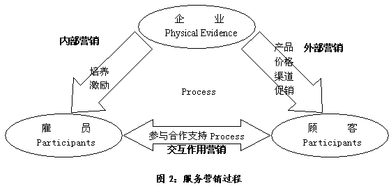 在20世紀70年代,服務業(yè)迅速發(fā)展起來。布姆斯和比特納(Booms and Bitner)于1981年在原來4Ps的基礎上增加了三個“服務性的P”:參與者(Participants,有的學者也稱之為人——People,即作為服務提供者的員工和參與到服務過程中的顧客),物質展示(Physical Evidence,服務組織的環(huán)境以及所有用于服務生產過程及與顧客溝通過程的有形物質),過程(Process,構成服務生產的程序、機制、活動流程和顧客之間的相互作用與接觸溝通),從而形成了服務營銷的7Ps。 服務營銷過程如圖2所示。